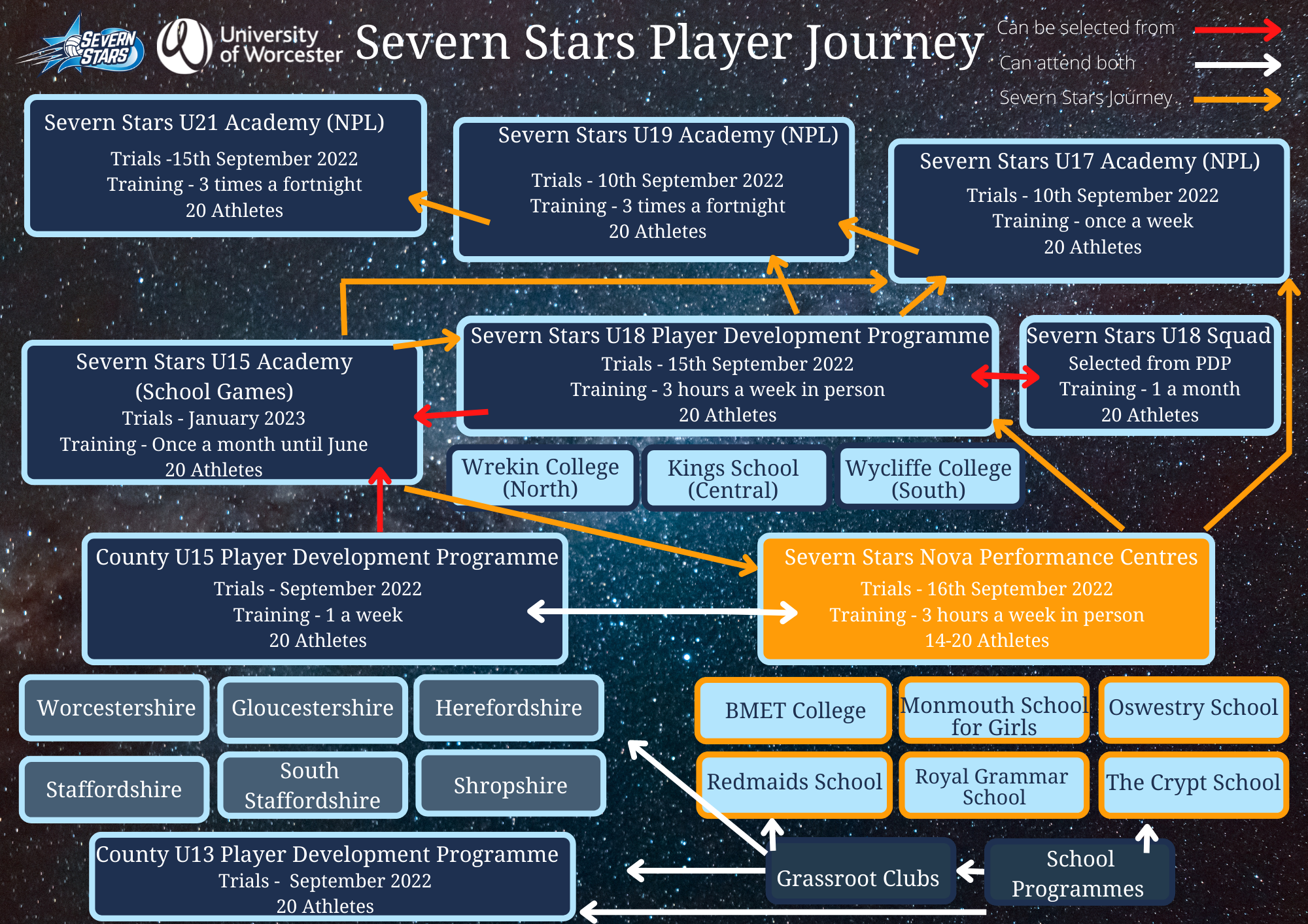 At Severn Stars, we have been working with England Netball and our Performance board to ensure we offer all players the best opportunity to develop and to represent Stars. Please see below our Severn Stars Player Journey for 2022/23 season with brief descriptions of all stages
